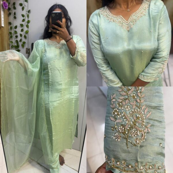 Pastel Green Pure Chinon Chiku contrast embroidery kurta set (Prefer for Next Size) - PMA76
