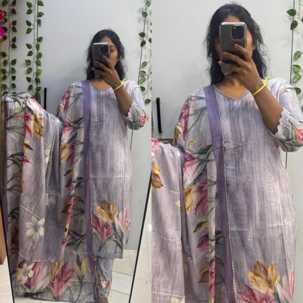 Dark Violet floral with beats work Cotton kurta with Soft Mul Dupatta Set - PMA194