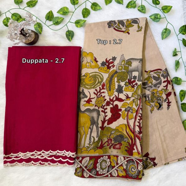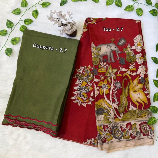 Chiku Kalamkari premium handloom silk Top (2.7m upto 3) with cutwork Red Dupatta (2.7m) Unstitched Dress material – PMK14