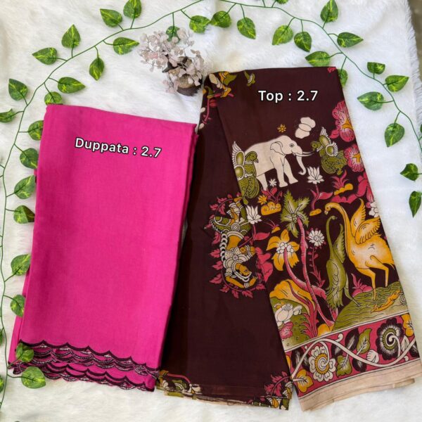 Brown Kalamkari premium handloom silk Top (2.7m upto 3) with cutwork Pink Dupatta (2.7m) Unstitched Dress material – PMK11