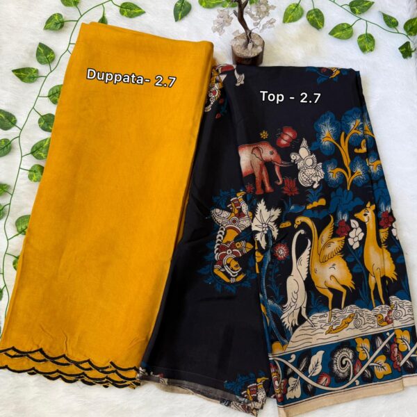 Black Kalamkari premium handloom silk Top (2.7m upto 3) with cutwork Yellow Dupatta (2.7m) Unstitched Dress material – PMK13