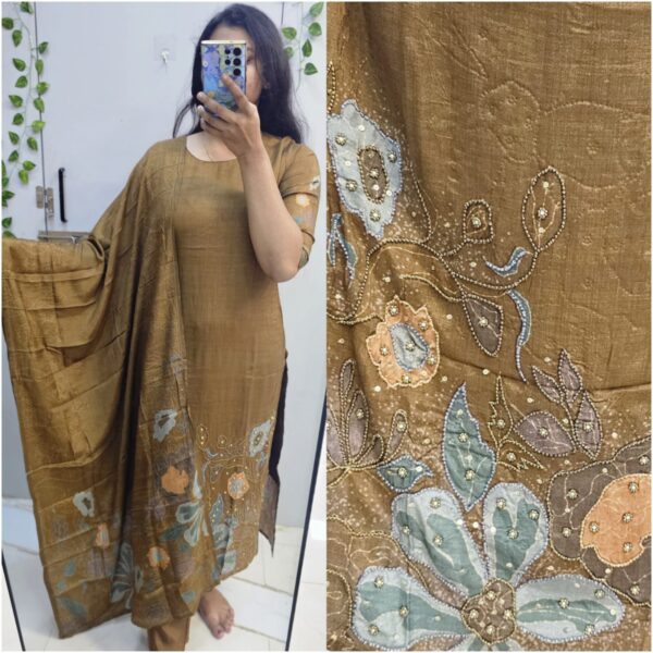 ₹1,699.00Original price was: ₹1,699.00.₹1,199.00Current price is: ₹1,199.00.Brown muslin 3D- Embossing - kurta set -PMA89