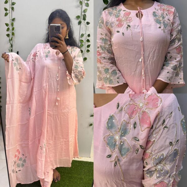 ₹4,500.00Original price was: ₹4,500.00.₹3,495.00Current price is: ₹3,495.00.Baby Pink Chinon Fabric Pure Handwork with Hand Painted Dupatta (DRY WASH ONLY)
