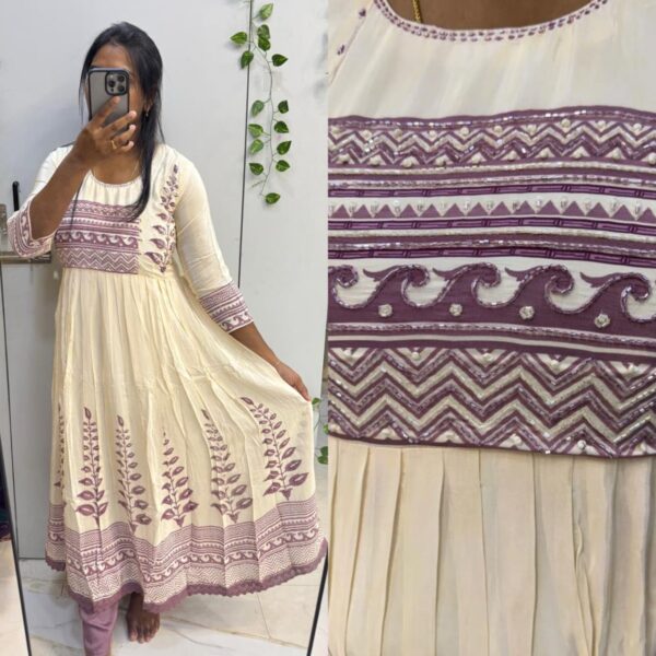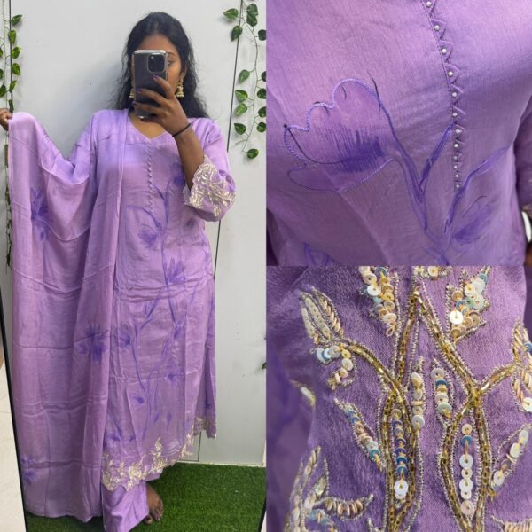 ₹4,500.00Original price was: ₹4,500.00.₹3,495.00Current price is: ₹3,495.00.Lavender pure chinon Anarkali with handwork painted all over (DRY WASH ONLY)