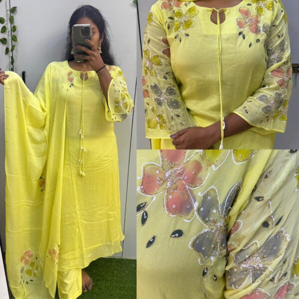 ₹4,500.00Original price was: ₹4,500.00.₹3,495.00Current price is: ₹3,495.00.Lemon yellow chinon fabric pure handwork with hand painted Dupatta (DRY WASH ONLY)