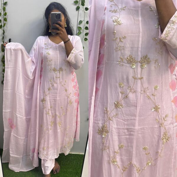 ₹4,500.00Original price was: ₹4,500.00.₹3,495.00Current price is: ₹3,495.00.Baby pink pure Chinon Anarkali with all over handwork (DRY WASH ONLY)