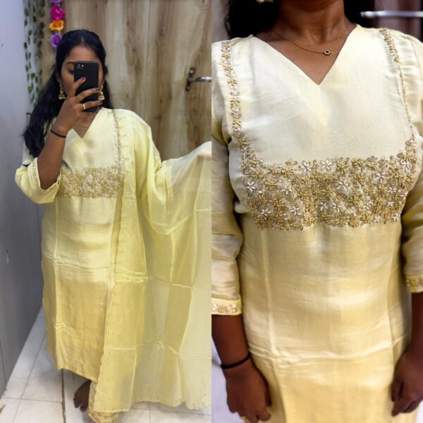 ₹3,199.00Original price was: ₹3,199.00.₹2,395.00Current price is: ₹2,395.00.Gold Tissue kurta with thread pearl embroidery kurta set - PMA176