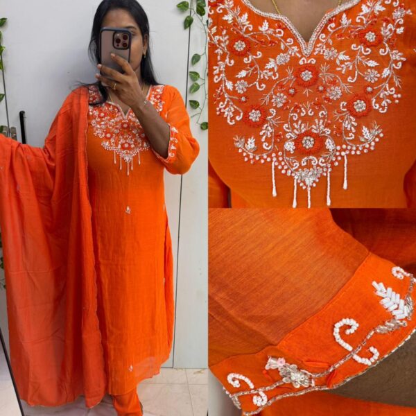 ₹2,500.00Original price was: ₹2,500.00.₹2,200.00Current price is: ₹2,200.00.Orange With Pure Handwork Dola Silk 3pc Kurta Set (A- Line Top & DRY WASH ) - PM1A