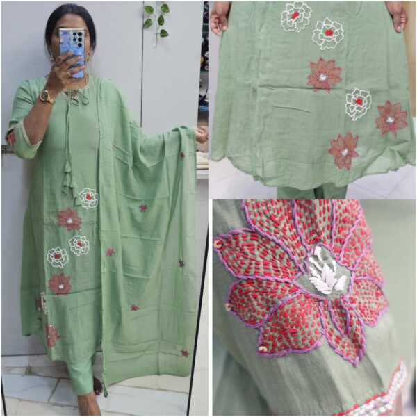 ₹2,599.00Original price was: ₹2,599.00.₹2,199.00Current price is: ₹2,199.00.Pure mulchanderi pista green A-line thread work kurta set - PMA121