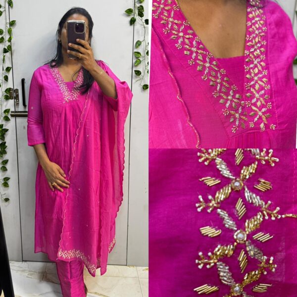 ₹2,999.00Original price was: ₹2,999.00.₹2,695.00Current price is: ₹2,695.00.Rani Pink Mulcotton Beats Work 3pc Kurta Set