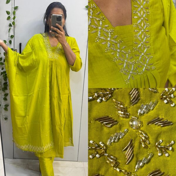 ₹3,999.00Original price was: ₹3,999.00.₹3,495.00Current price is: ₹3,495.00.Mehandi Green Mul Chanderi Handwork Kurta Set