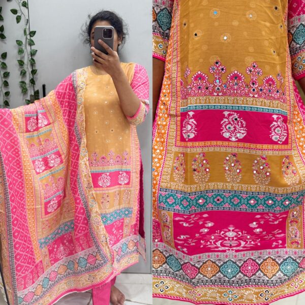₹1,550.00Original price was: ₹1,550.00.₹799.00Current price is: ₹799.00.Orange Pink Bandini Model Mirror 3pc kurta set (Prefer Next Size) - PMS016