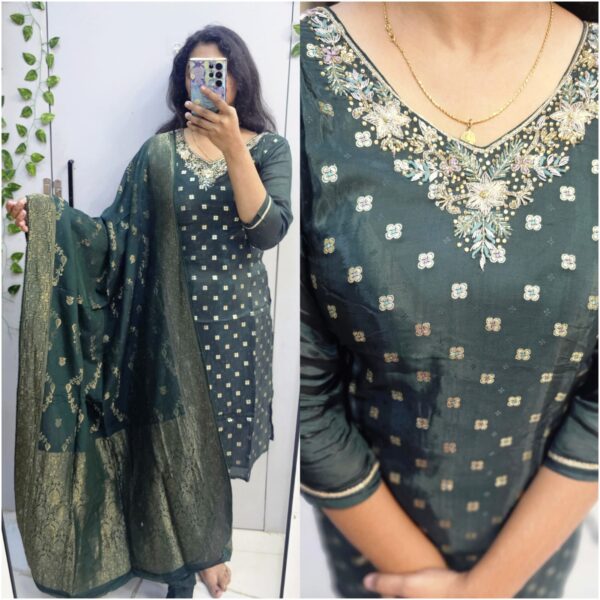 ₹3,500.00Original price was: ₹3,500.00.₹2,999.00Current price is: ₹2,999.00.Green banarasi Zari embossing - kurta set -PMA97