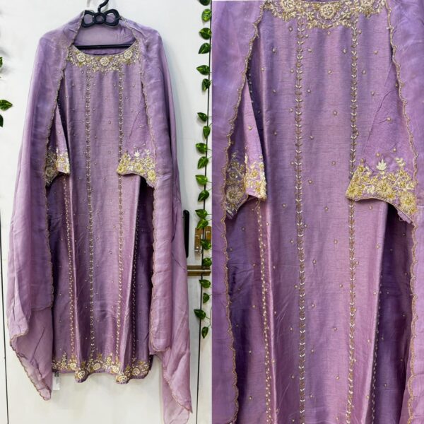 ₹4,500.00Original price was: ₹4,500.00.₹3,495.00Current price is: ₹3,495.00.Lavender pure chinon Anarkali with handwork painted all over (DRY WASH ONLY)