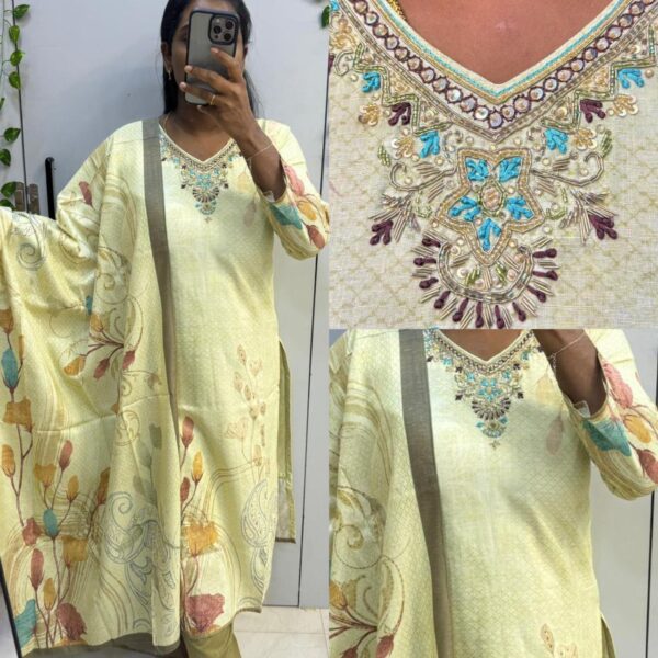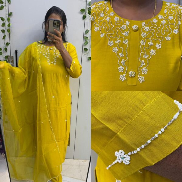 ₹1,750.00Original price was: ₹1,750.00.₹1,499.00Current price is: ₹1,499.00.Yellow Roman Silk Beats Work 3pc Kurta Set