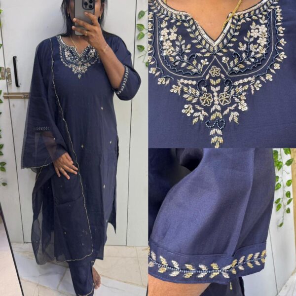 ₹1,750.00Original price was: ₹1,750.00.₹1,499.00Current price is: ₹1,499.00.Navy Blue Roman silk Beats Work 3pc Kurta Set