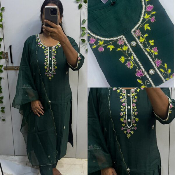 ₹1,999.00Original price was: ₹1,999.00.₹1,650.00Current price is: ₹1,650.00.Dark Green Roman Silk Beats Work 3pc Kurta Set