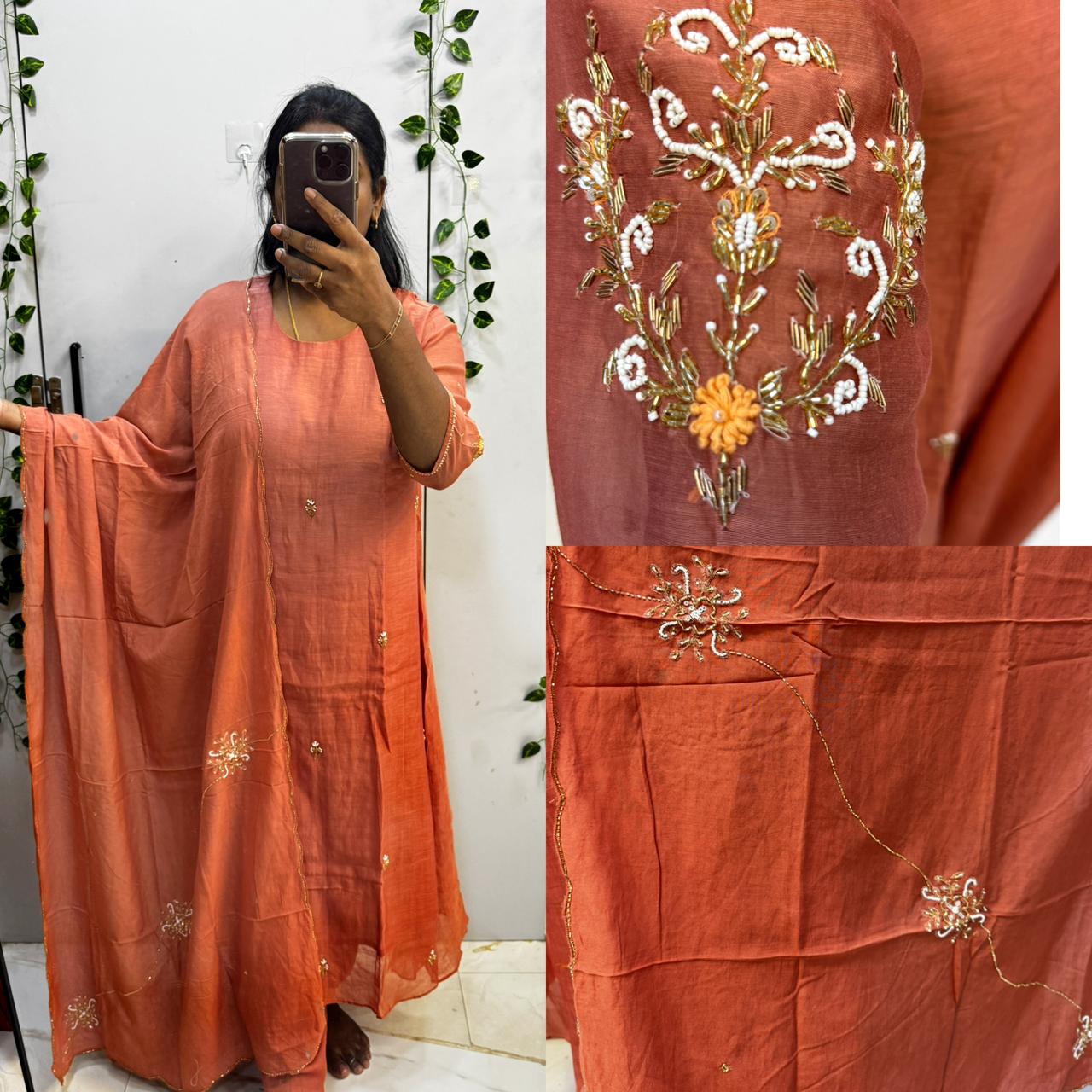- The Brick Mul Cotton Pure Handwork 3pc Kurta Set features a classic A-line silhouette, designed to flatter all body types gracefully. The kurta flows with an elegant flair while providing practicality with its breathable material for long hours of wear. Complemented by matching bottoms and an equally beautiful dupatta, this set ensures a complete and harmonious look without compromising on style or functionality. Elevate your wardrobe with this easy-to-maintain yet artistically wonderful attire.