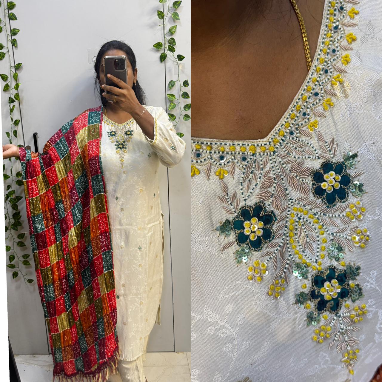 - This cream 3pc Kurta Set is more than just a partywear staple—it’s a canvas for versatile styling. Pair it with statement jewelry for a glamorous, festive look or keep it simple and elegant with minimal accessories for intimate gatherings. The lively Bandini dupatta elevates the outfit with a splash of color, ensuring you can adapt the look to any occasion while standing out effortlessly. Perfect for gifting or revamping your ethnic collection, this outfit brings timeless sophistication to your wardrobe.