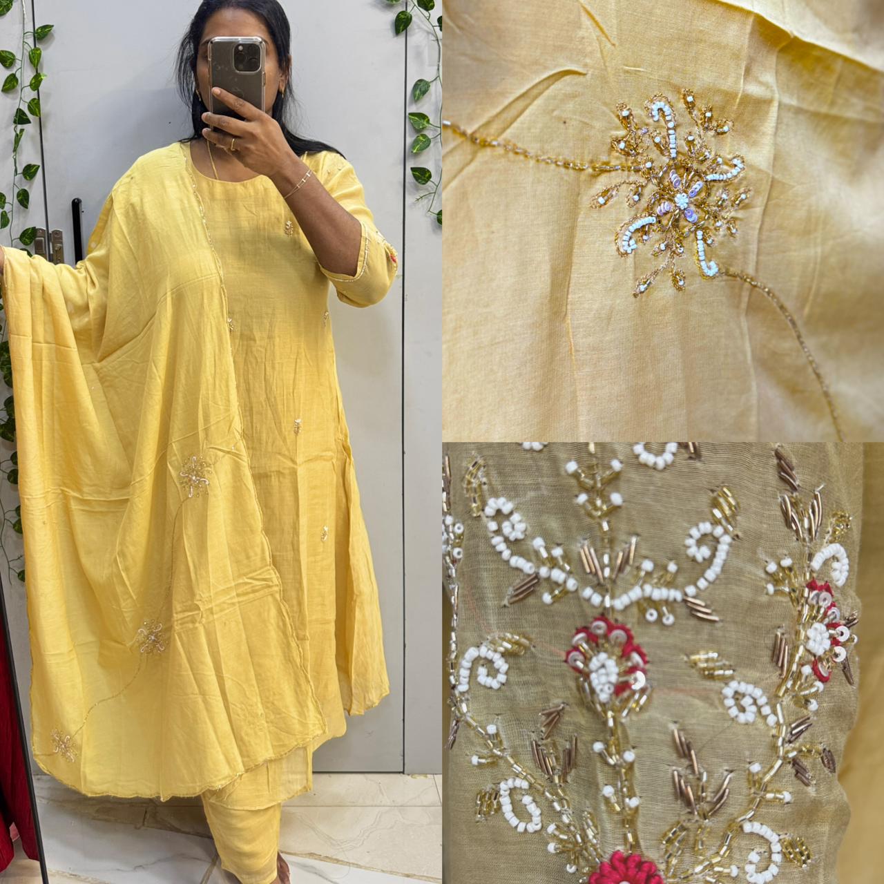 - Made from Mul cotton fabric, this kurta set ensures breathability and a soft touch against your skin. Mul cotton is well-known for its lightweight nature, making it the ideal choice for extended wear. Pairing comfort with style, the A-line design enhances the silhouette for a flattering and graceful fit. The craftsmanship showcases attention to detail, with handwork embroidery embellishing the kurta for an exclusive artisan finish.