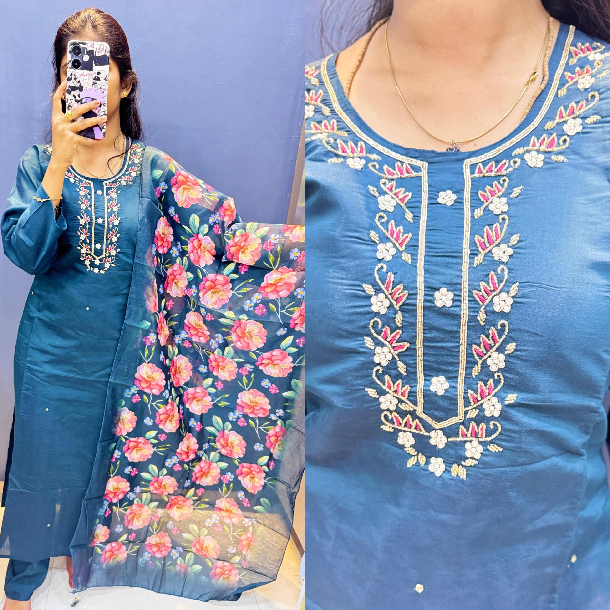 - Discover the perfect addition to your ethnic wardrobe with the Dark Blue Work Dupatta, adorned with captivating floral prints. This dupatta combines timeless beauty with contemporary charm, ensuring you stand out in any festive or formal occasion. Crafted with care and precision, it is designed to complement your favorite traditional ensembles, adding grace and refinement at every step.