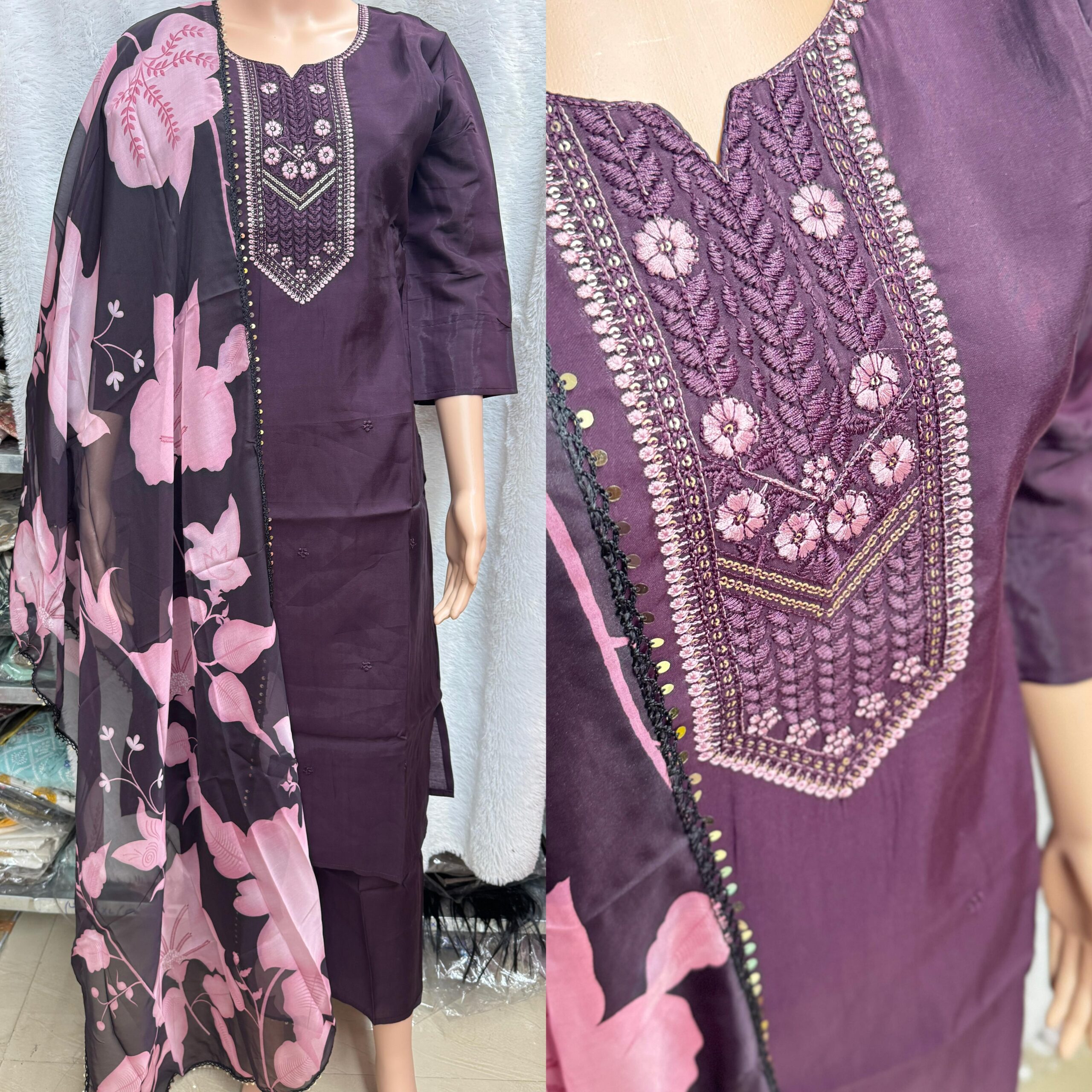 - Comprising three meticulously tailored pieces, the Dark Wine Roman Silk 3pc Set offers versatility like no other. The top features a soft, seamless finish with intricate Roman-inspired details, while the flowing bottoms complement the ensemble with their graceful silhouette. The wrap or scarf completes the set, offering creative styling options to suit your mood or occasion. Together, these pieces form a harmonious design that offers unmatched adaptability, catering to both formal and semi-casual settings.