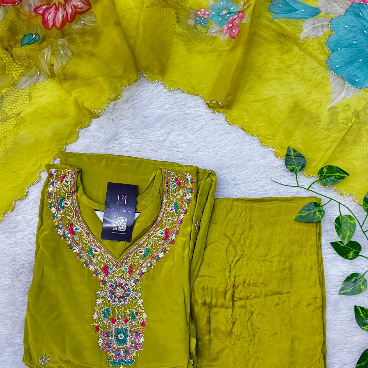 Kurta + Pant + Dupatta This kurta set is designed to offer the perfect harmony between tradition and modernity. The kurta features high-quality pure crape fabric, known for its luxurious texture and exceptional durability. Complemented by the organza viscose dupatta, the outfit is lightweight, breathable, and perfect for any season. The subtle lemon shade adds a refreshing softness that suits a variety of occasions and enhances your natural beauty.