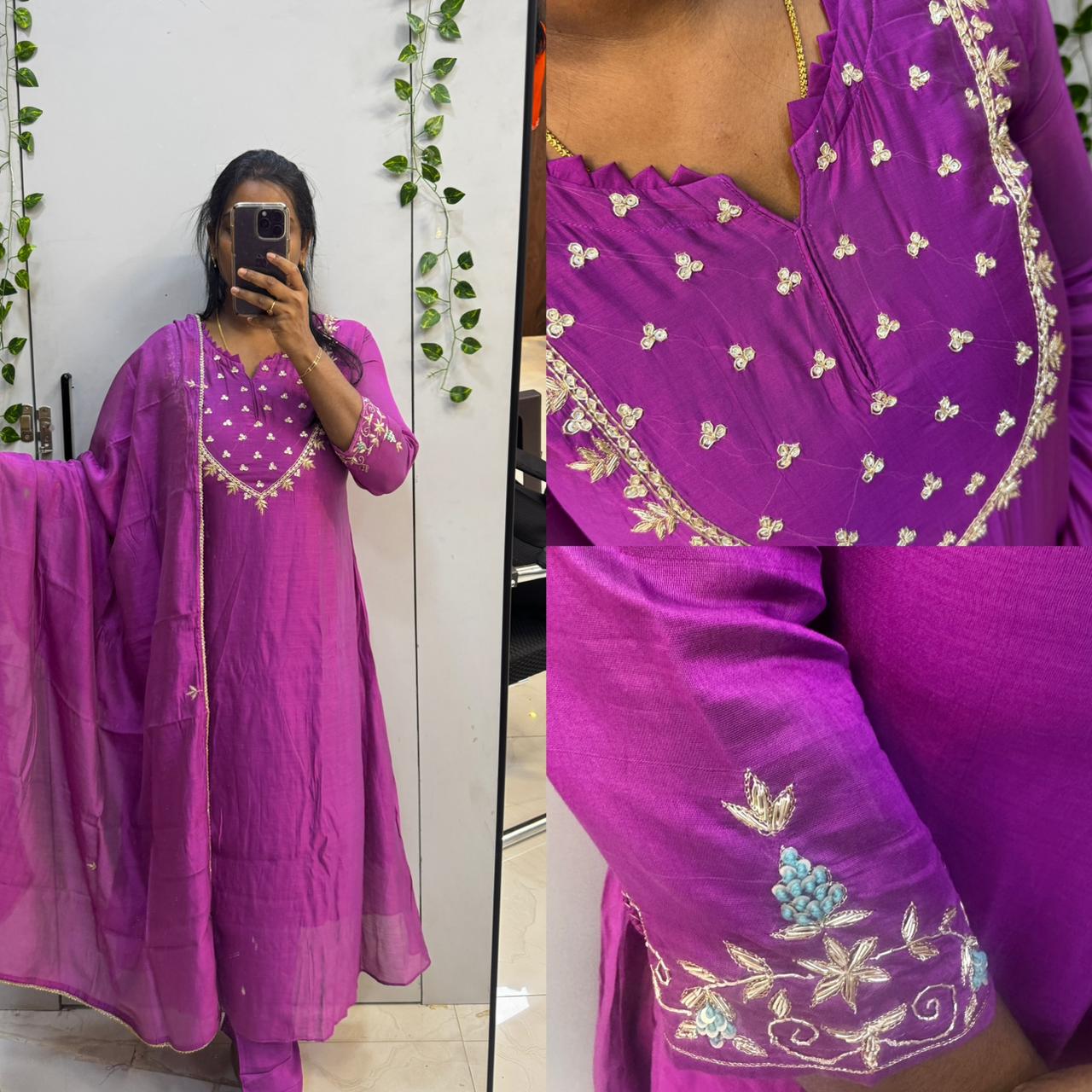 - This set includes three perfectly coordinated pieces: the Anarkali-style kurta, a complementing bottom, and a delicately crafted dupatta. The kurta flows elegantly with its Anarkali silhouette, embodying a timeless charm. The bottom ensures ease of movement while preserving the overall grace of the outfit, and the dupatta adds the finishing touch with its subtle elegance, completing the regal look. Designed to offer versatility, this Necklace Design 3pc Kurta Set Mul Chanderi (Anarkali) is ideal for day-to-night transitions—perfect for weddings, festive gatherings, or even formal events. With its premium material, exemplary design, and supreme comfort, this outfit celebrates your unique style while emphasizing cultural heritage.