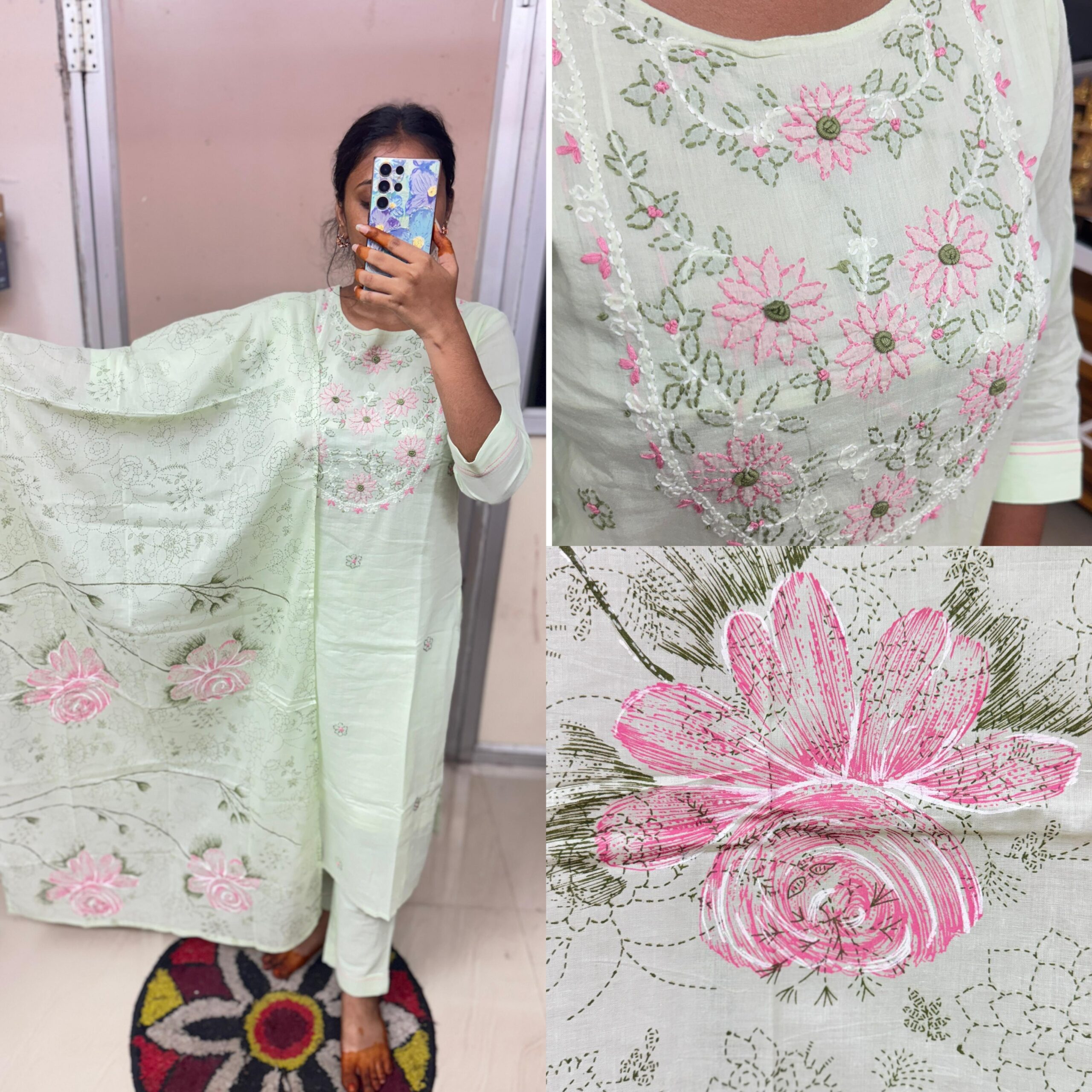 - The Pista Green Mul Cotton Thread Embroidered Kurta Set is designed with versatility in mind. The kurta comes with a flattering, contemporary silhouette that suits different body types, complemented by soft, tapered bottoms for a polished look. Its intricate detailing and effortless drape make it ideal for casual settings or semi-formal occasions. Pair it with simple accessories or let its embroidery shine on its own – the choice is yours!