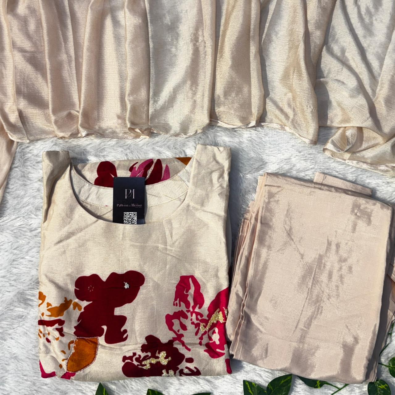 - The kurta features beautifully detailed embroidery that highlights traditional design elements, offering a harmonious blend of modern sophistication and cultural aesthetics. The attention to detail ensures every stitch adds charm to your look. Accompanied by a coordinated bottom and a matching dupatta, this set exudes elegance from every angle.