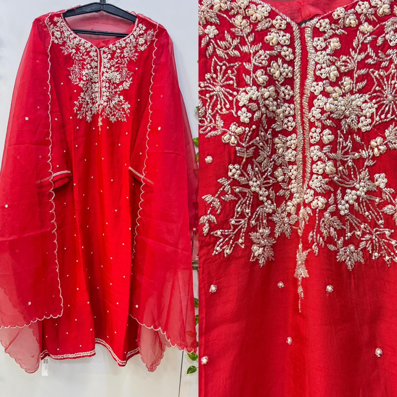 - The Red Designer Handwork Kurta Set is made from high-quality fabric, ensuring a supple and comfortable fit throughout the day. The vibrant red hue symbolizes passion and festivity, making this outfit the perfect choice for celebratory occasions. The fabric itself is lightweight and breathable, designed for wearers who value comfort alongside unmatched aesthetic appeal. With hand-embellished patterns and precision detailing, this kurta set embodies timeless elegance and richness.