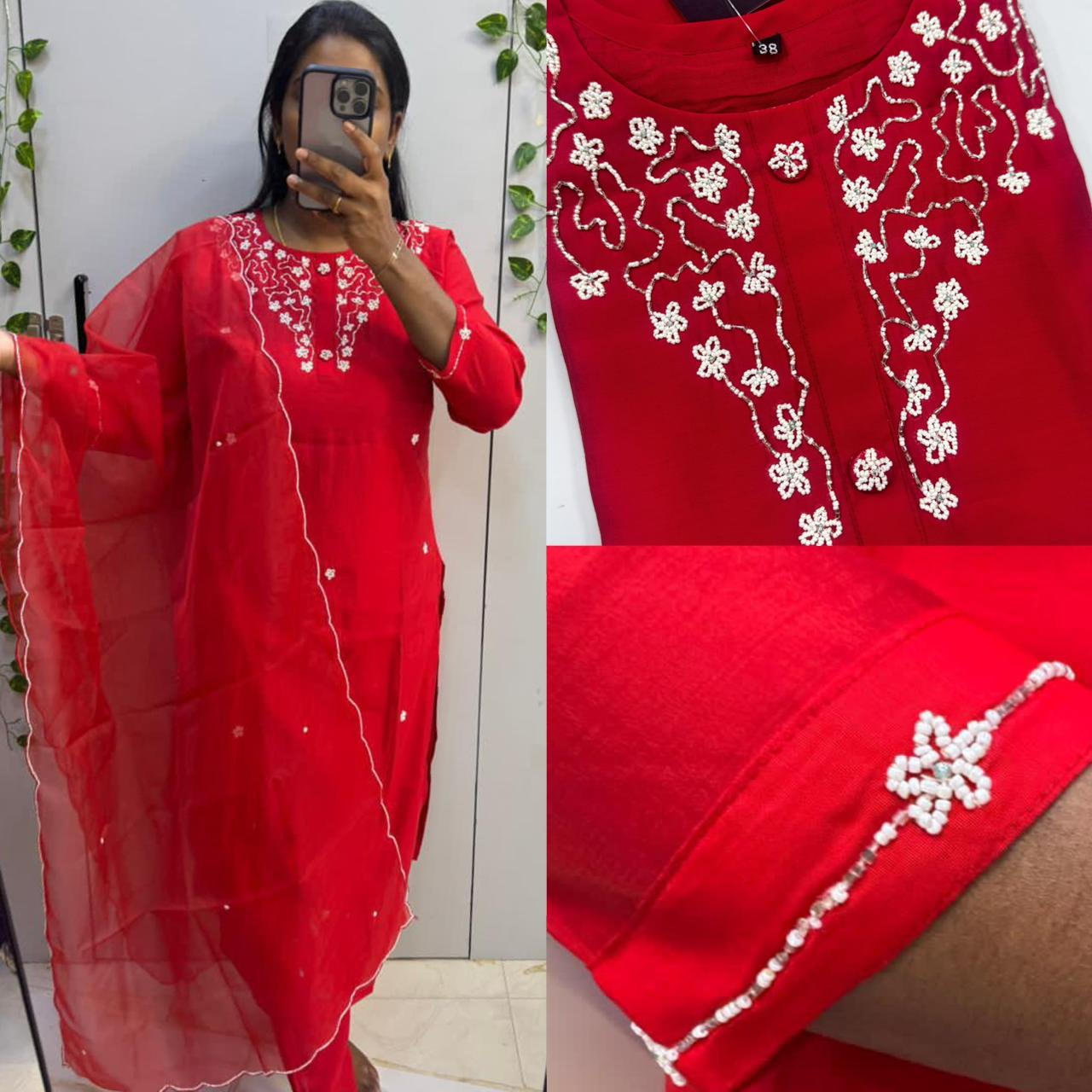 - Elevate your style with the captivating Red Roman Silk Beats Work 3pc Kurta Set. Crafted for those seeking both sophistication and comfort, this kurta set combines timeless design with modern craftsmanship. Its airy silk fabric ensures effortless wear while exuding a luxurious feel, making it the perfect addition to your wardrobe for celebrations, events, or even formal get-togethers.