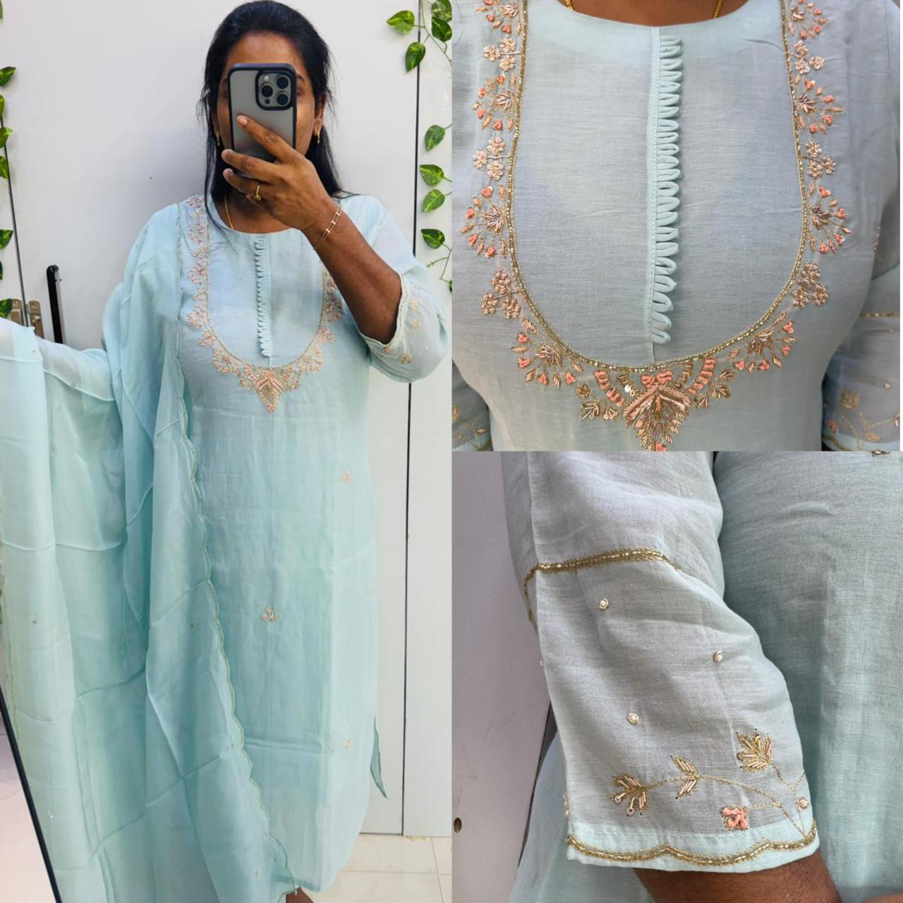 - The unique handwork on this kurta set adds a distinctive charm that elevates its overall appeal. The intricate embroidery is complemented by the soothing sea blue tone, making it a versatile choice for various settings. Whether worn during daytime celebrations or evening events, this kurta set offers a subtle yet striking aesthetic that reflects timeless artistry.
