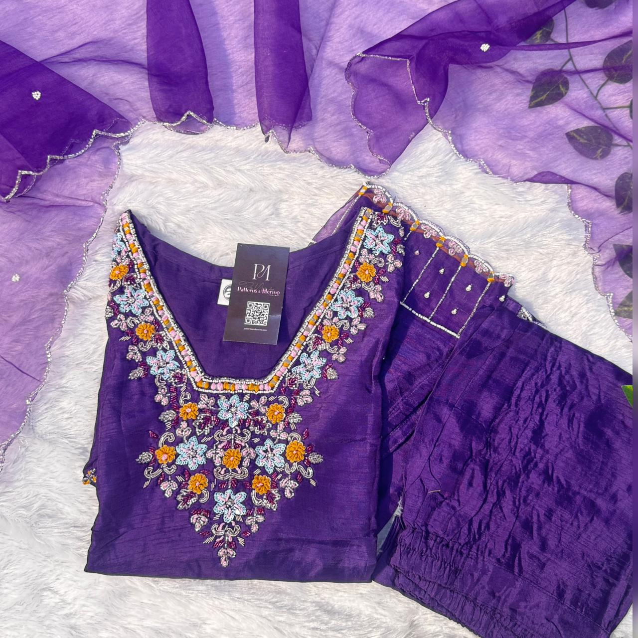 The Violet Pure Dola Silk with Organza Dupatta is the epitome of sophistication. Whether it is a wedding function, traditional celebration, or a special evening, this chic outfit ensures you stand out. The alluring violet hue gives it a timeless appeal, making it perfect for people of all ages. Designed for those who appreciate quality and style, this ensemble captures the beauty of ancestral craftsmanship blended with modern-day refinement.