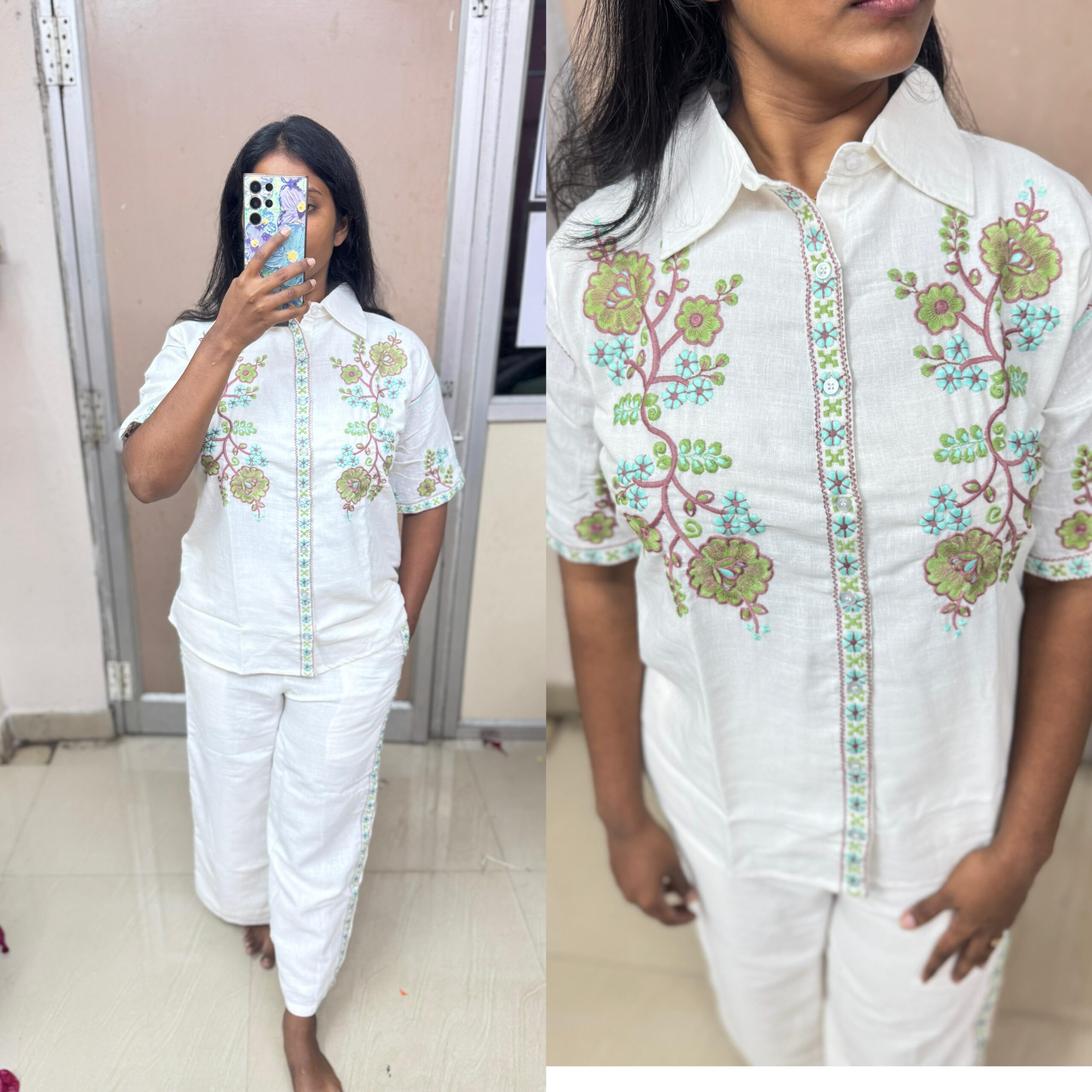 - Crafted with care, this co-ord set features intricate embroidery that adds a touch of sophistication to its minimalistic design. The breathable and skin-friendly inner lining keeps you comfortable, even during long hours of wear. The monochromatic white color radiates a clean and modern appeal, perfect for anyone looking to stay timeless yet trendy. Ideal for pairing with your favorite accessories, this set offers the flexibility to dress it up or down effortlessly—making it a must-have in your wardrobe.