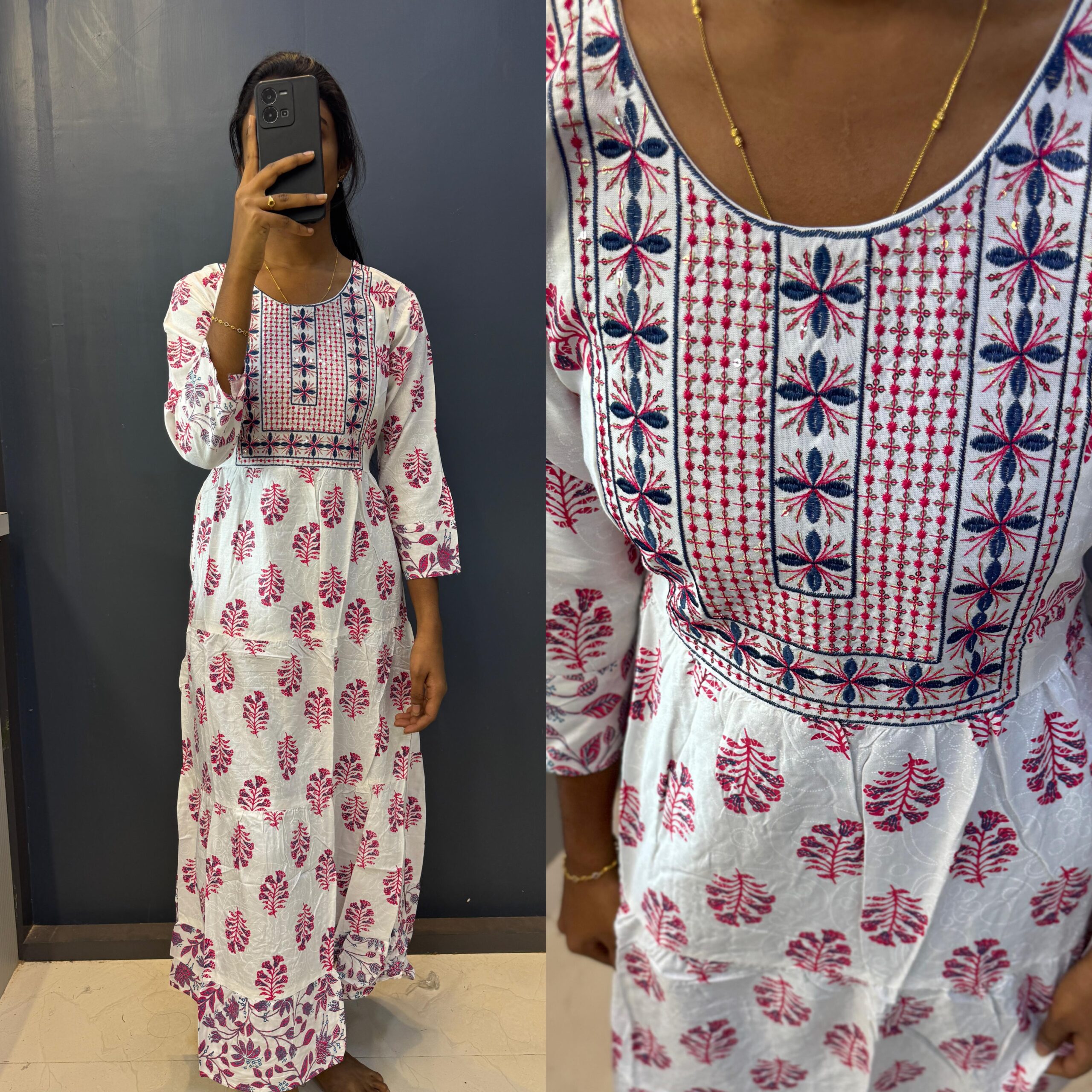 - The elegant white base is adorned with subtle prints, adding a touch of charm and character to the design. The richness of the material not only enhances the appearance but also ensures durability, so you can enjoy wearing this frock for years to come. Plus, it’s easy to maintain, offering convenience without compromising on sophistication.