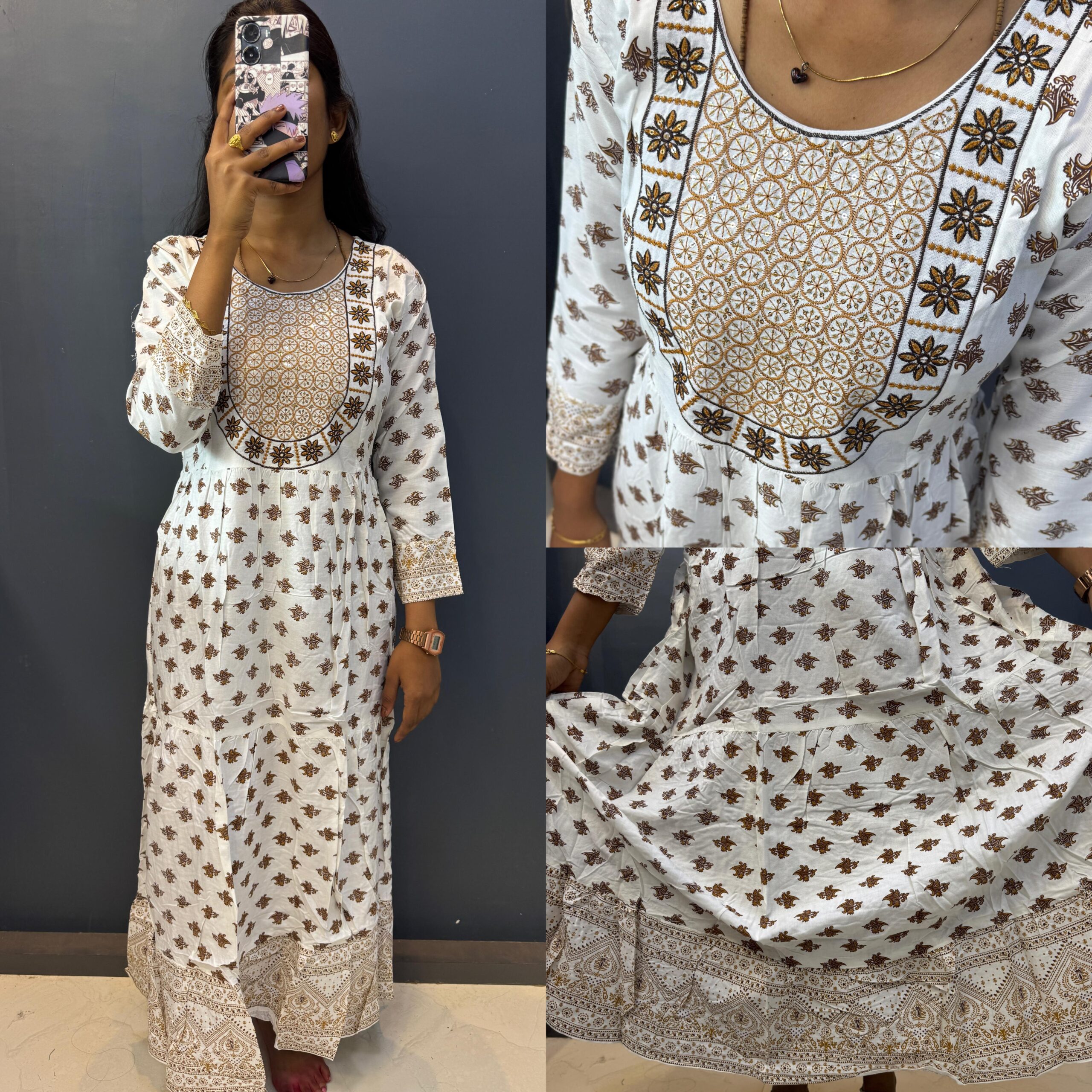 - The unique umbrella silhouette of this frock adds a touch of sophistication to your wardrobe. Its flowing design flatters a variety of body types, making it universally appealing. Whether paired with minimalist accessories for daytime elegance or styled with statement jewelry for an evening outing, this frock adapts beautifully to your styling needs.