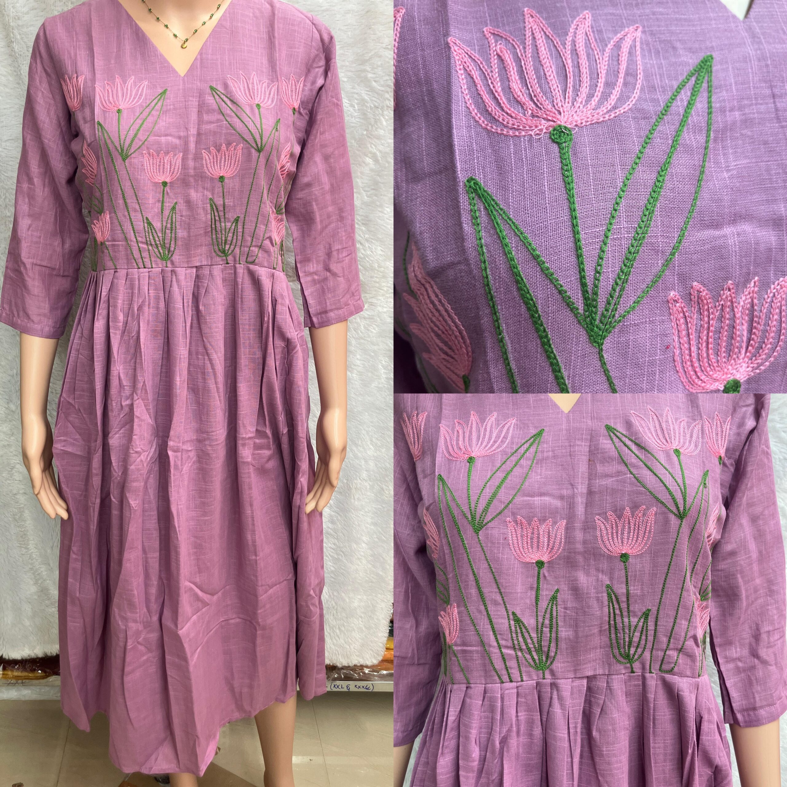 Cotton Pink With Contrast Floral Thread work Frock with lining