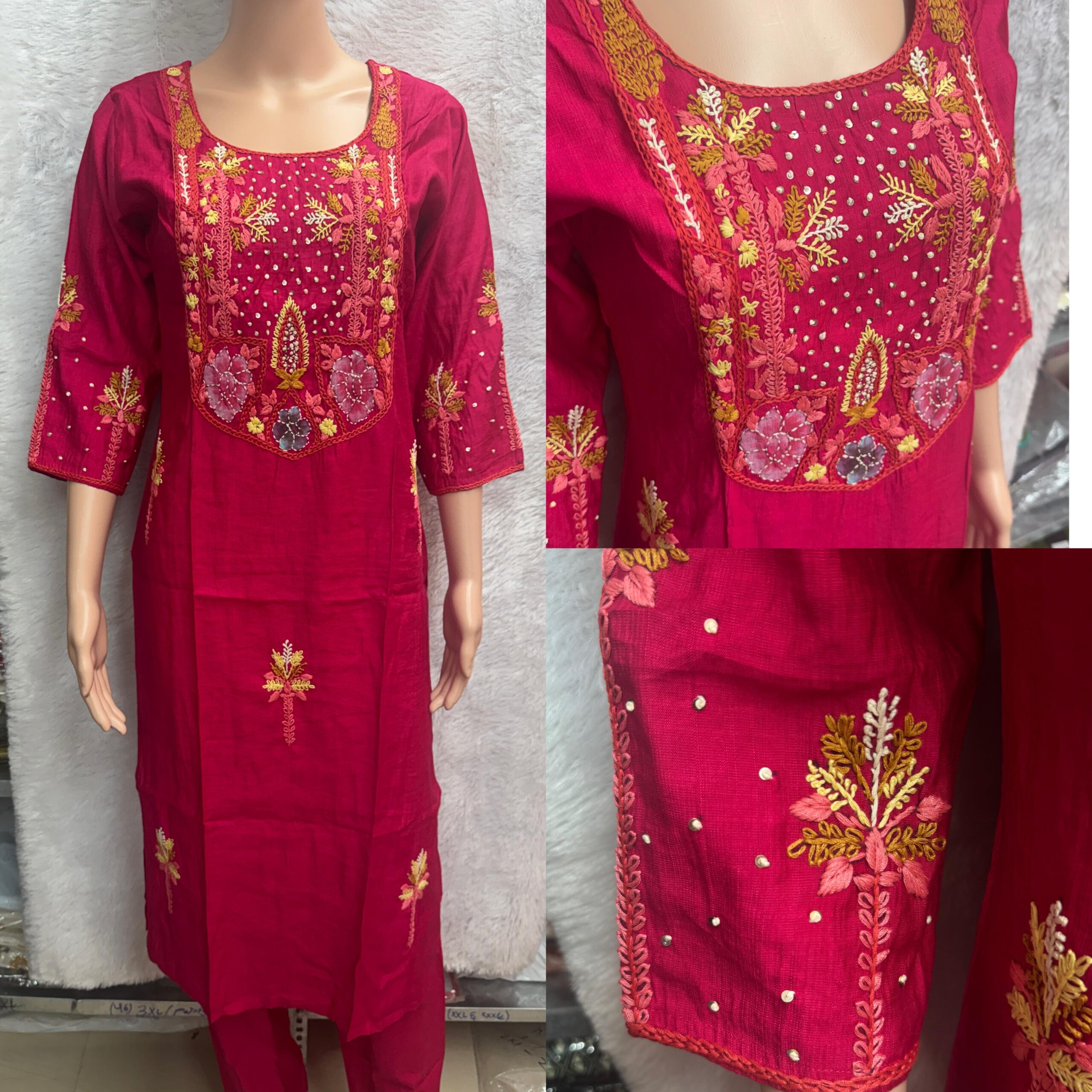 - At the heart of this outfit is the extraordinary craftsmanship. The intricate embroidery speaks volumes about the dedication and skill poured into every stitch. Designed to create a subtle yet captivating aesthetic, the hand-done embroidery effortlessly elevates the charm of the pink hue. Whether dressing up for special occasions or adding a touch of sophistication to your daily wardrobe, this ensemble is truly versatile.