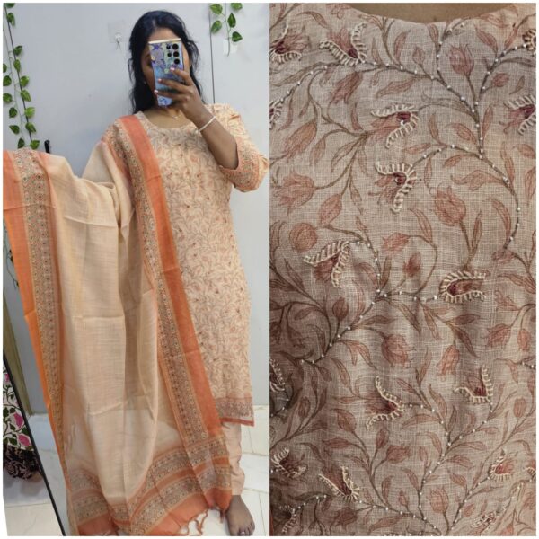 Orange Premium Jamdani Linen with mulcotton lining all over embroidery kurta set (Prefer next size) - PMA55