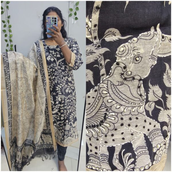 ₹2,499.00 – ₹2,599.00Price range: ₹2,499.00 through ₹2,599.00Black Premium Pen Kalamkari with mulcotton lining all over embroidery kurta set (Prefer next size) - PMA56